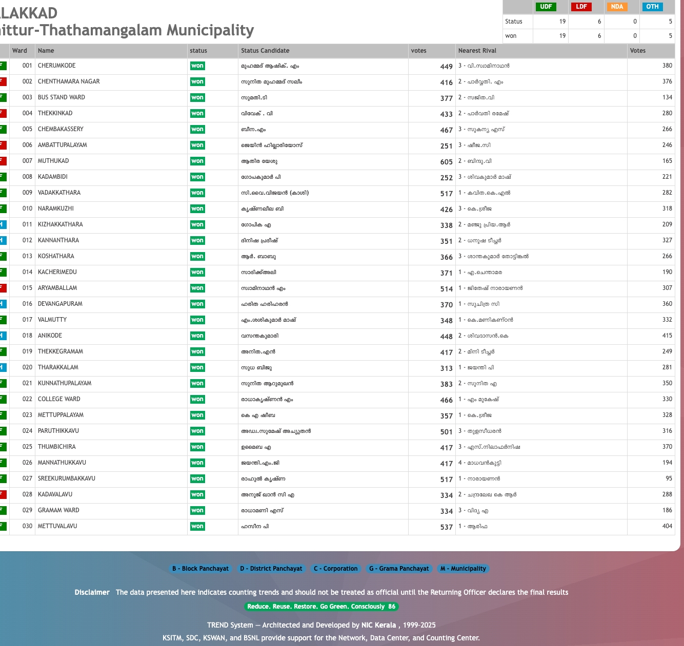 The Chittur-Tattamangalam Municipal Election 2025 has concluded, with counting displayed through the TREND system used by the Kerala State Election Commission (NIC Kerala).